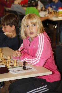 U-DM (U8): Nelli Zsigri Dyndgaard fik 3/7 og Axel 1½/7. For Nellis vedkommende er dette den første turnering (udenfor Skoleskak regi) hun har deltaget i, mens Axel lige før denne store udfordring deltog i U-KM. Nelli delte 4.pladsen med lige så mange point som en garvet skakspiller som Oliver Watts fra BMS, hvis man kan sige det om dreng under 8 år. Meget flot af Nelli, mens Axel ikke havde den medgang som han fik U-KM. Stort tillykke med den enorm flotte pokal til Nelli, som samtidig kan kalde sig danmarksmester for piger under 8 år. Vinder af gruppen blev favoritten Albert Merchlenburg Møller (1201) fra Frem med 7/7.
